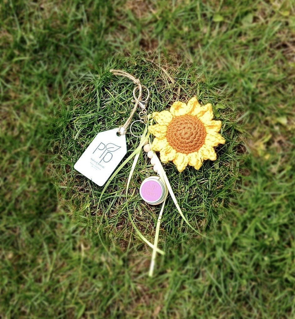 With crocheted sunflower, vegan lip balm and ceramic heart (you can fragrance with your favourite scent.)